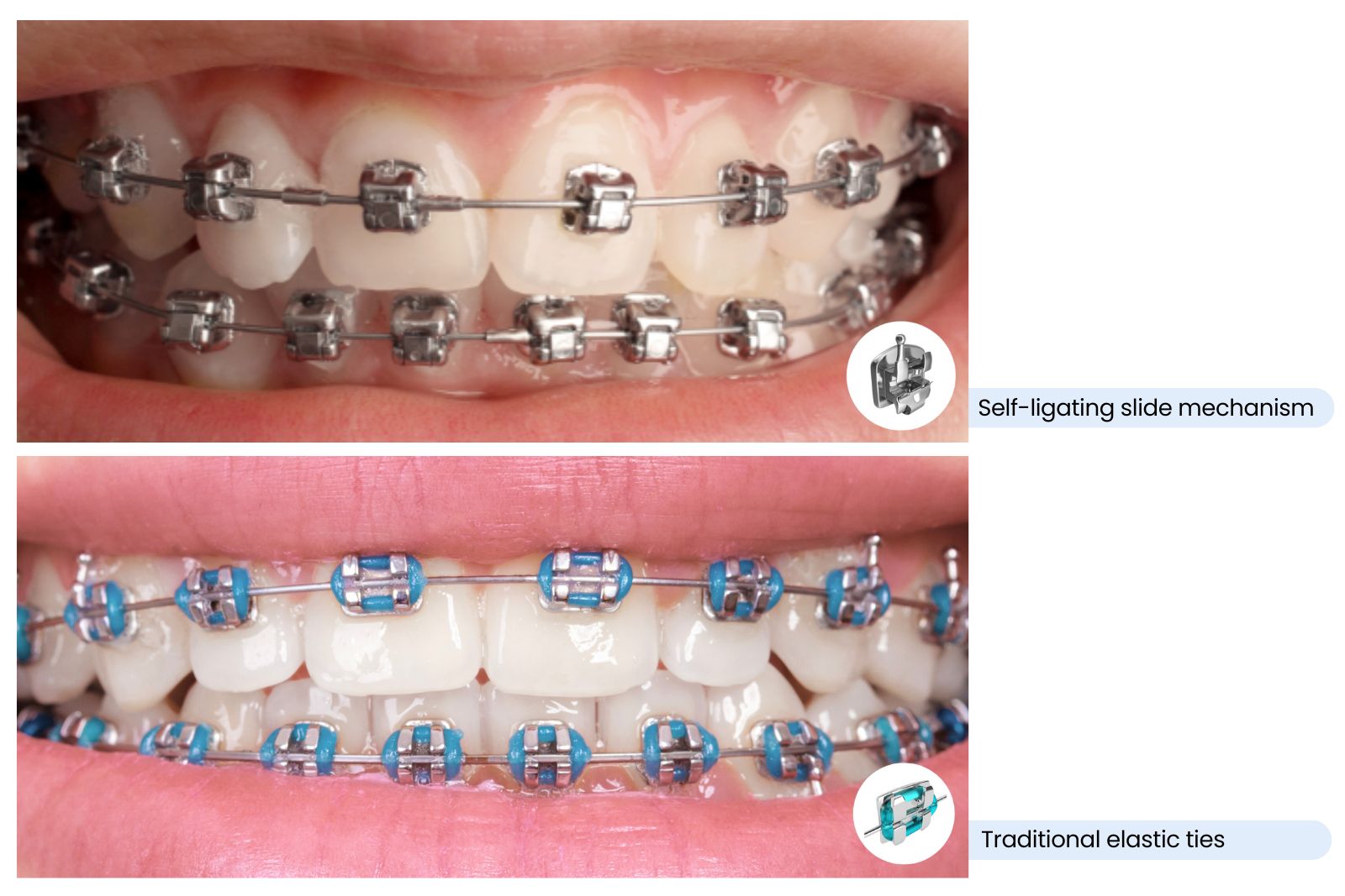 Self-ligating braces work exactly like metal braces except that they do not use rubber bands. Metal braces require rubber bands to connect the metal brackets, but self-ligating braces require clips to hold the wires to the bracket. Due to this, these braces won’t look as noticeable as compared to traditional braces.