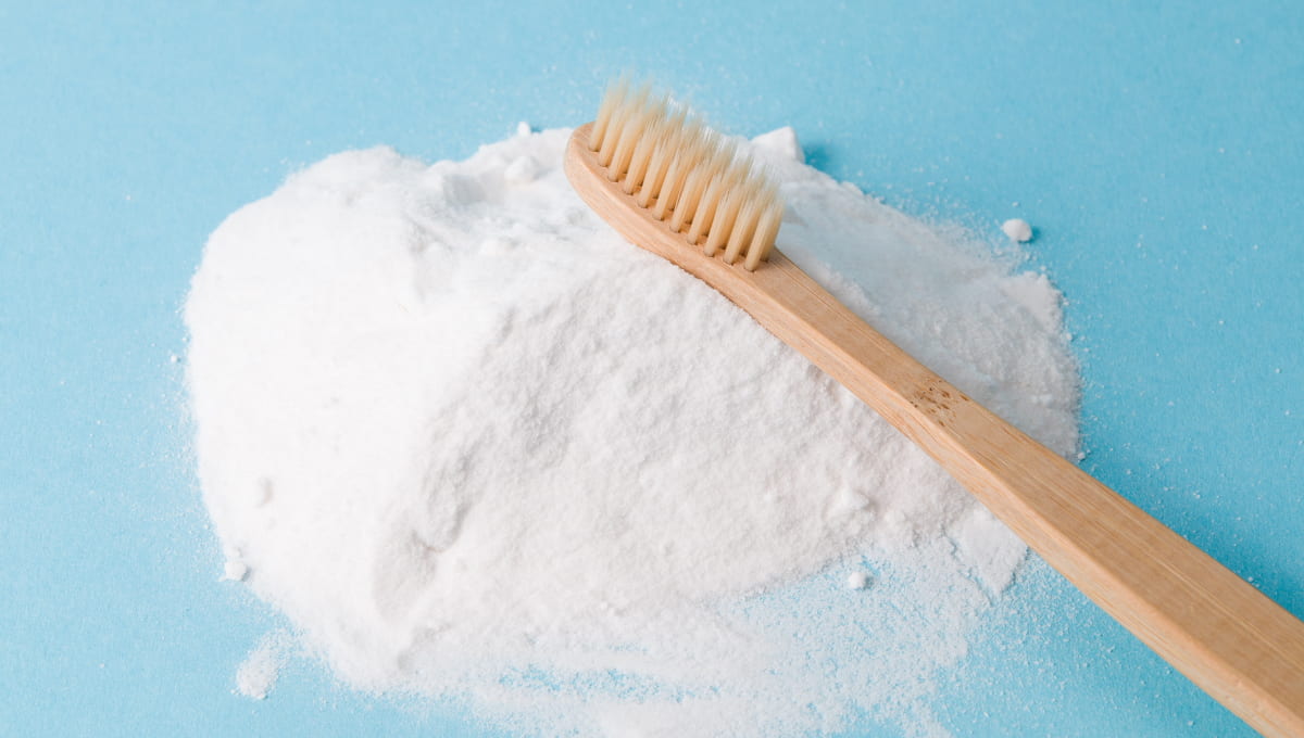 Baking soda, or sodium bicarbonate, is a mild abrasive that helps polish teeth and remove stains without damaging enamel.
